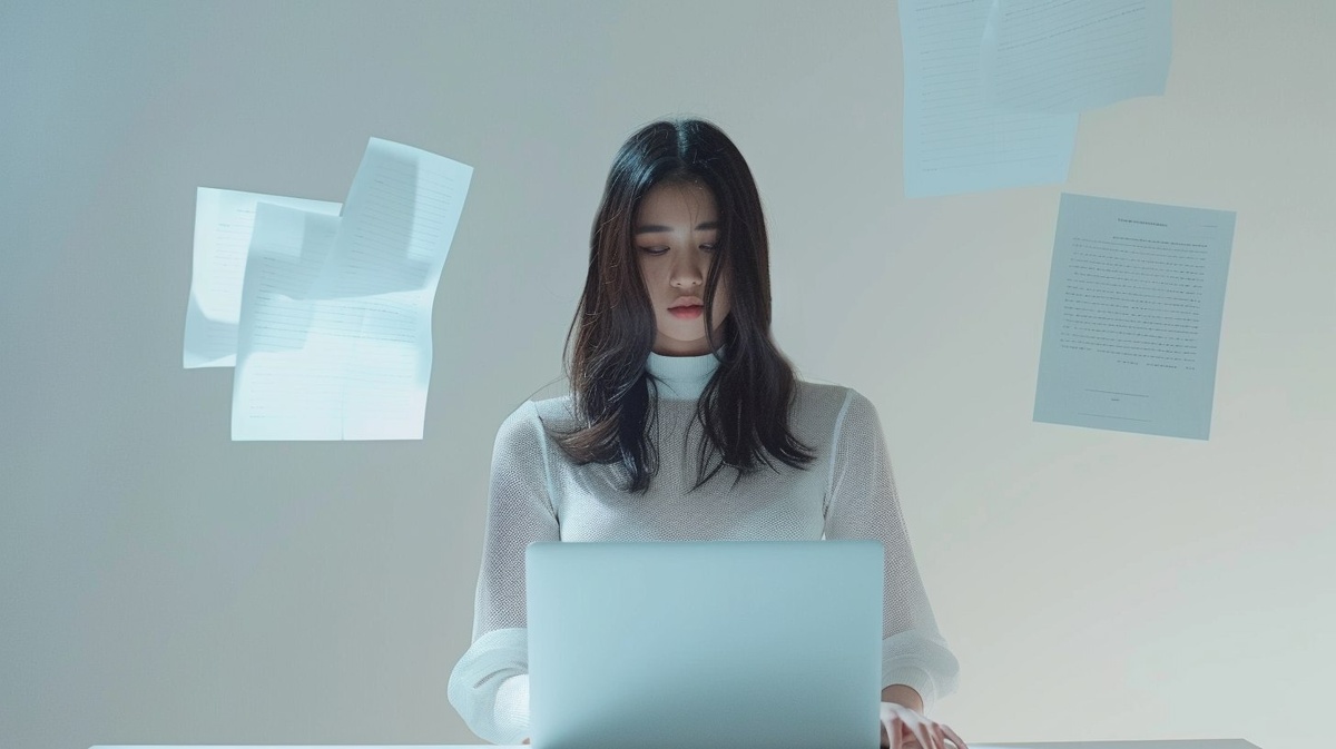 Создано на основе запроса: Realistic young woman in a white top, standing and using laptop at a desk. Two glowing documents floating in air. Clean white background, soft light, Canon EOS R5