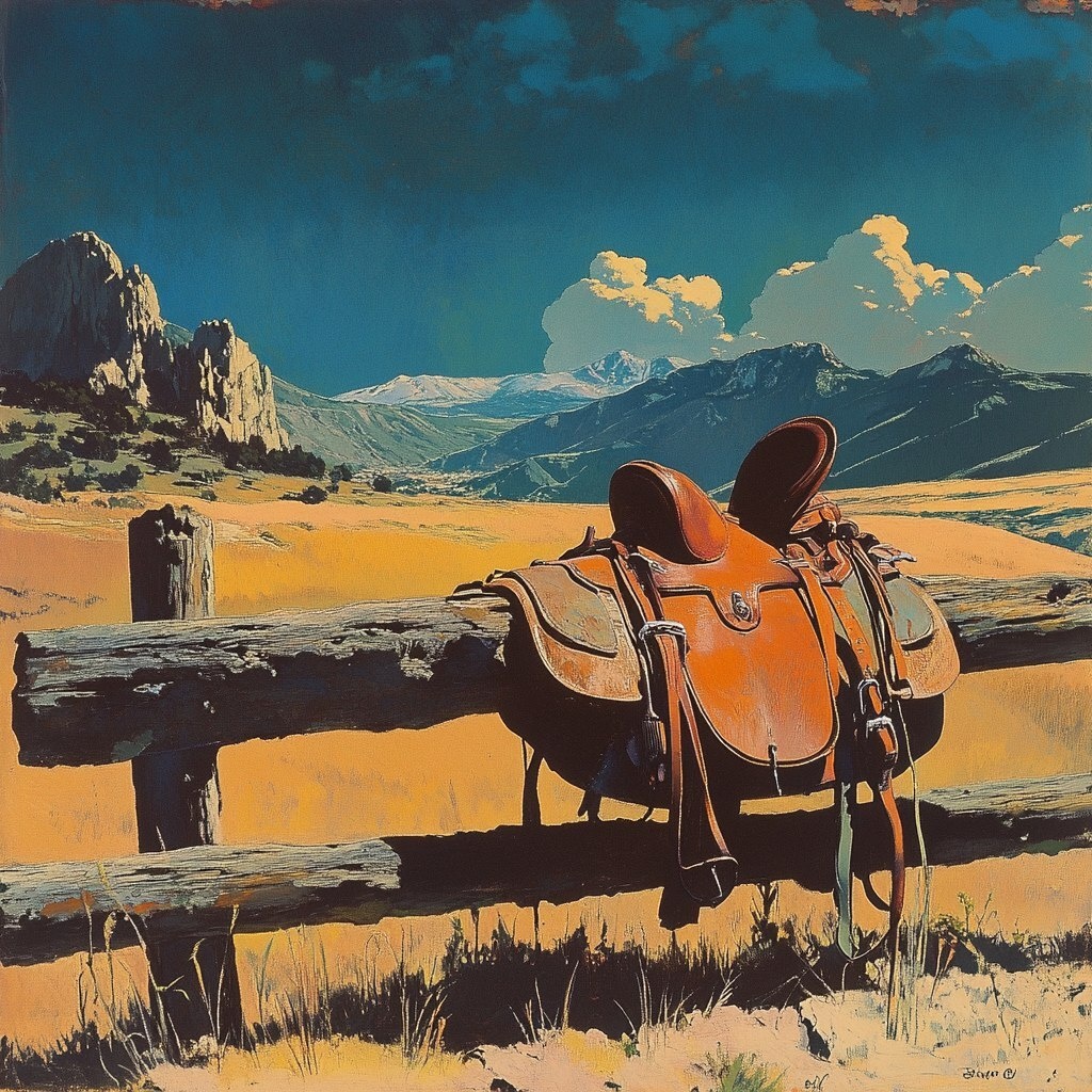 Создано на основе запроса: saddle resting on a fence overlooking a mountainous landscape