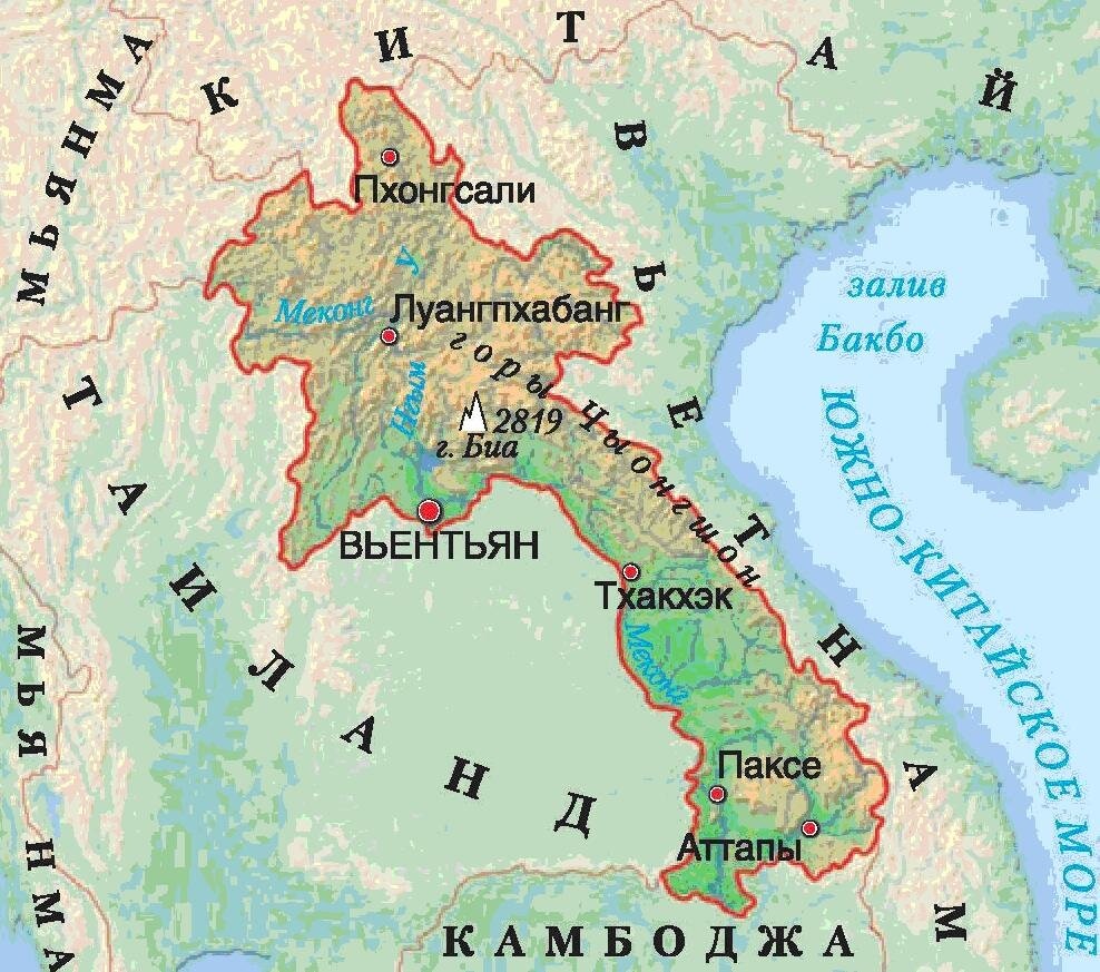 Лаос — государство в Юго-Восточной Азии, не имеющее выхода к морю. Оно граничит с Китаем, Вьетнамом, Камбоджей, Таиландом и Мьянмой. Столица страны — Вьентьян. Лаос известен своими живописными пейзажами, включающими горы, густые джунгли и реки, среди которых самое важное место занимает Меконг. В стране преобладает тропический климат с выраженным сезоном дождей и сухим сезоном. Население Лаоса составляет около семи миллионов человек, при этом основное этническое ядро составляют лаосцы, но также проживают многочисленные этнические меньшинства. Государственным языком является лаосский, а религия образована преимущественно буддизмом. Исторически Лаос был частью различных королевств, а в XX веке находился под влиянием Франции как часть Французского Индокитая. В 1975 году после длительных вооружённых конфликтов была установлена Народно-Демократическая Республика Лаос. Экономика страны базируется на сельском хозяйстве, гидроэнергетике и экспорте природных ресурсов. В последнее время развивает