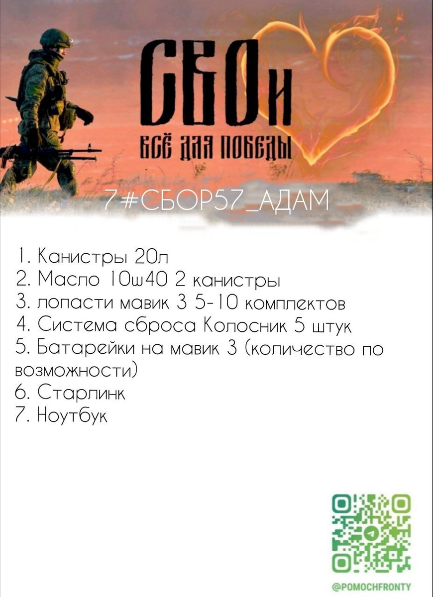 ⚡️СБОР для Адама (Разведка БПЛА) После того как враги разнесли их позицию, большую часть дорогого оборудования парни купили сами. С остальным - просят помочь СВОих. Пострадал ноут для работы и прошивки для Мавиков. ( ранее переданный ноут у расчета фпв) 6. Старлинк 3в - 49813 https://ozon.ru/t/WfSKYnW 7. Ноут 49 012 ( включая таможенный платеж) https://ozon.ru/t/tehZyVd Александр Иванович Батарейки, лопасти , сбросники - быстро изнашиваются. Так как палет у птиц колоссальный. Села - батарееку поменяли и тут же полетела. И так 24/7 ❗️Сумма сбора : 188 545 44 000 🔥 Помочь СВОим ФРОНТ Т-Банк: 2200701225452439 Тел. для перевода по СБП (Т-Банк): 89936125765 Юлия Ф./Иван П. 🇷🇺У БОГА НЕТ ДРУГИХ РУК, КРОМЕ НАШИХ 🇷🇺