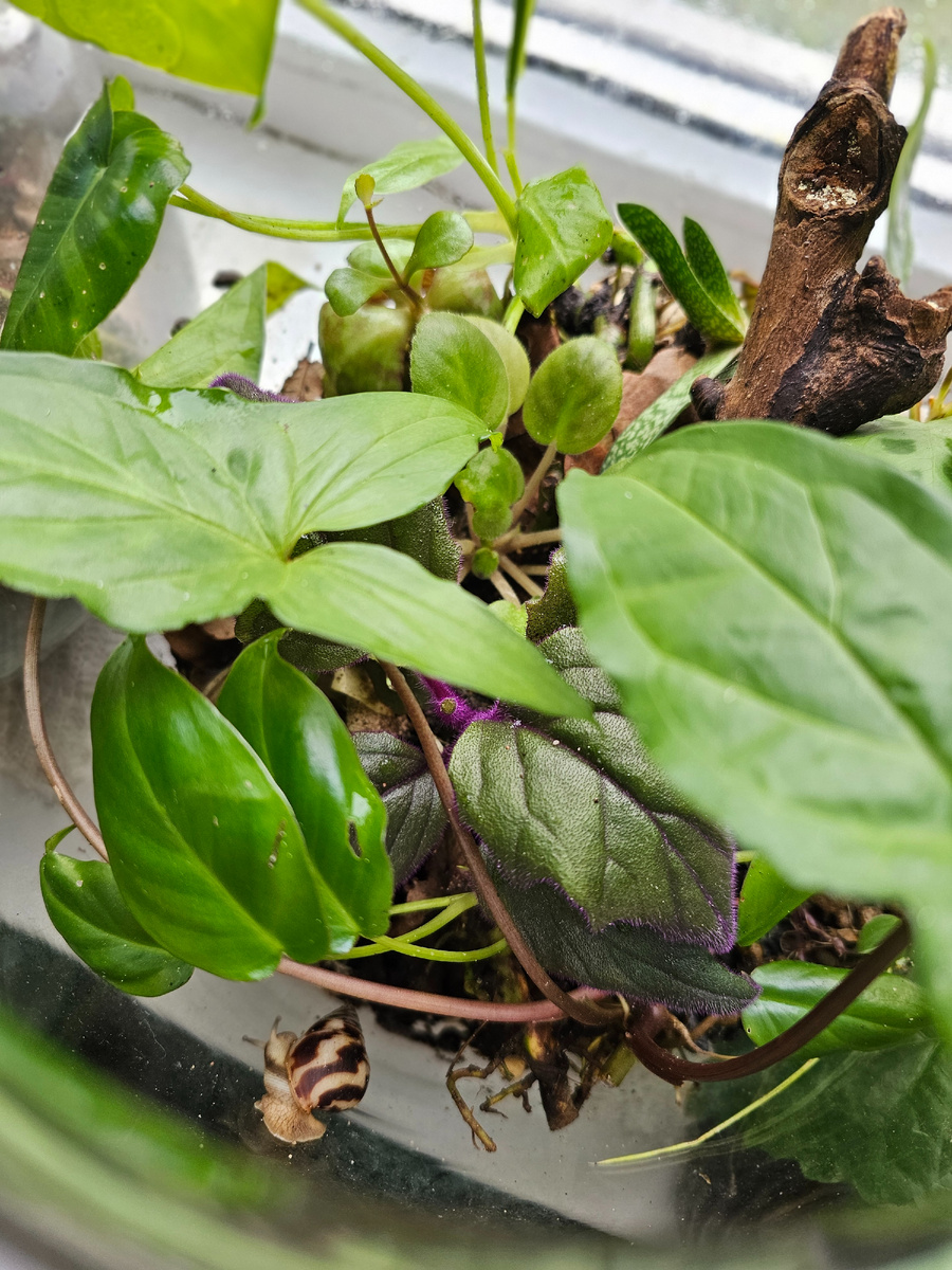Иногда их увидишь не сразу среди зелени, хотя всё это задумано было про них - про улиток, ради улиток, из-за улиток. Но они хорошо прячутся, и можно подумать, что это просто флорариум, палюдариум, каких сейчас много, хороших и разных. Спортивный азарт - поселить улиток с растениями и сохранять баланс жизни. Создать среду, и минимально вмешиваться. Отпустить ситуацию, и иногда заглядывать. В дневное время это и вправду только флорариум, маленькие джунгли, комнатные тропики. Зимний сад в стеклянной банке. Парниковый эффект творит чудеса, зелень прёт как бешеная. Но есть и загвоздка, куда же без неё: растениям нужно солнышко, улитки любят полумрак. Кстати, пора сказать про улиток: их время - ночь, именно ночью идёт основная программа, куда включены и цирк, и театр, и реалити-шоу, - они умеют всё. Для твоей бессонницы нет лучшего развлечения. Не спится - идёшь глазеть на улиток. Но и днём иногда они выступают в подарок, для души. Так а что же солнце?.. эээ, братцы, тут вопрос не про