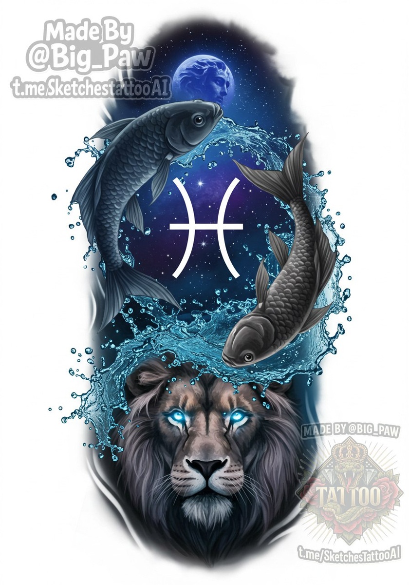 #2317 Подборка по запросу подписчика - лев и рыбы. Или, если уже есть подобная подборка с этими знаками, можете скинуть 🧠 SYNTX 💳 Донат 😎 НейроБро 💀 Эскизы от нейросети #лев #рыбы #знакзодиака #эскизы #тату #татуировки