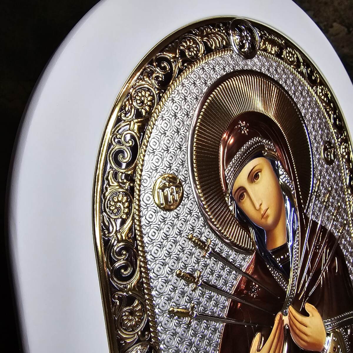 Семистрельная икона Божьей Матери — почитаемая, сильная, оберегающая православных христиан от невзгод и бед. На иконе Матерь Божия изображена без Младенца, голова наклонена вправо, грудь пронзают 7 мечей. Три меча справа и четыре с левой. Есть еще вариант, что по обеих сторон по три и один снизу. Там где Матерь Божия одна иконописцы тем самым изображают с целью прославить Её. Что означает икона Семистрельная. В ней полнота всех страданий, которую претерпела Богородица. Число 7 на эту как раз указывает, означает «совершенство, изобилие, избыток Через Него как бы Матерь Божия говорит я с вами. А еще можно описать ее как близкую людям, полное грехов. И каждый из нас как бы семью мечами или стрелами, то есть семь глазами причем боль Богородице. То есть глубина ее переживаний, как сильно ранят Её людские грехи. История обретения Иконе не менее 600 лет. Вологодский крестьянин нашел первообраз иконы на церковной колокольне, где она лежала ликом вниз, служа доской в одной из ступеней. Перед эт