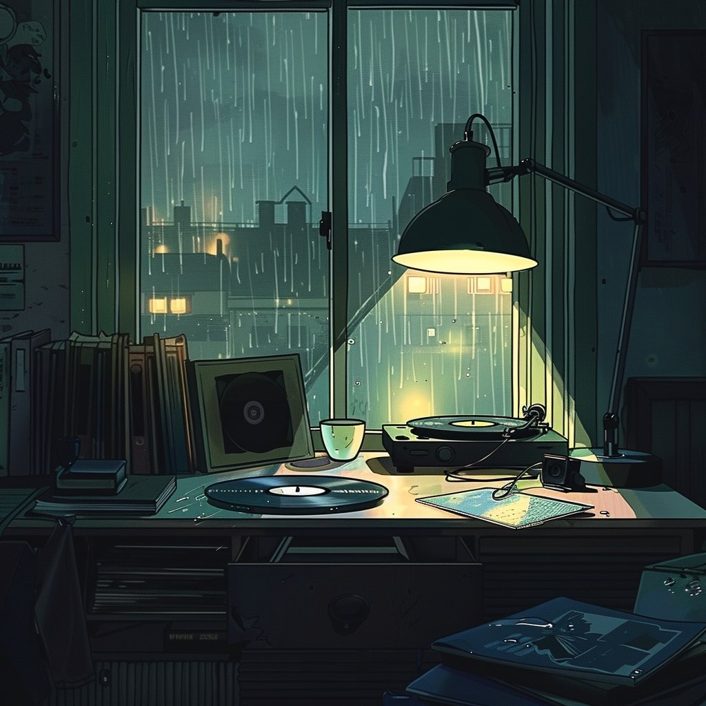 Создано на основе запроса: Lo-fi album cover, cozy empty room at night, desk with an old lamp, glowing warm light, rain softly falling outside the window, vinyl record player spinning, vintage anime style, soft shadows, peaceful and nostalgic mood --- Автоперевод: Обложка альбома Lo-Fi, уютная пустая комната ночью, стол со старой лампой, светящийся теплый свет, дождь мягкий падает за окном, вращение винилового пластинка, винтажный стиль аниме, мягкие тени, мирное и ностальгическое настроение Классно выглядит? 🤔 https://dzen.ru/id/65c0c65c86e4f837c27b24d7 #ИИ #AI #нейросеть #midjourney #art