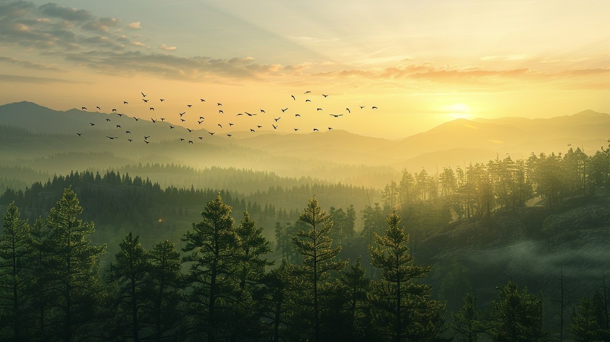 Создано на основе запроса: a high-resolution wide landscape featuring [the woods], seen from a distance, with [birds], [moutains], soft