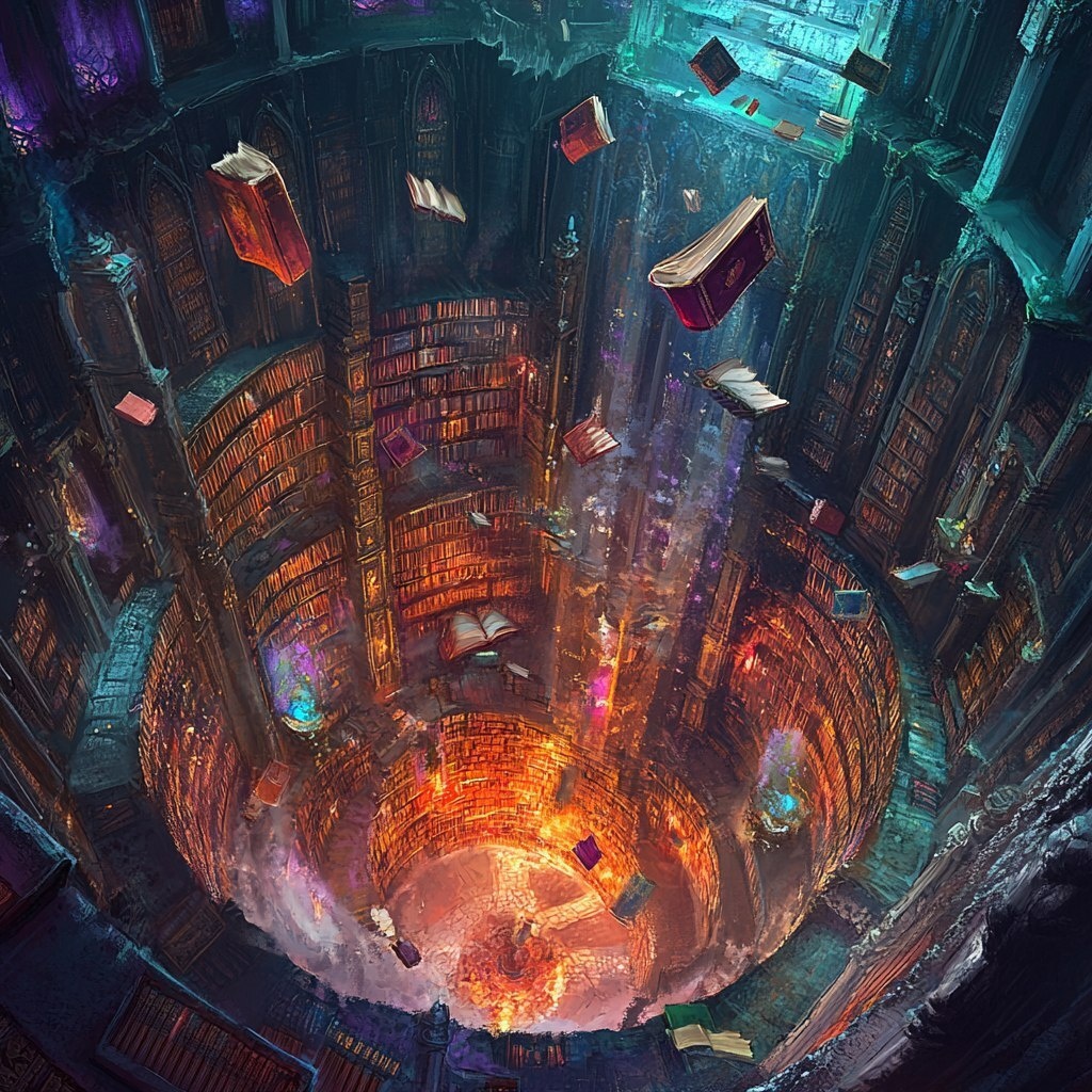 Создано на основе запроса: giant magical library within the underdark, books flying around, magical artifacts everywhere, top down view, vast, big, colorful