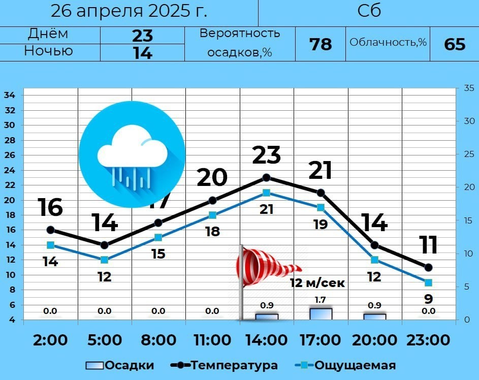 ☔️⚡️26 апреля в Кургане будет переменная облачность и возможен небольшой дождь. Будьте внимательны: вероятность грозы - 50% 🌩️
