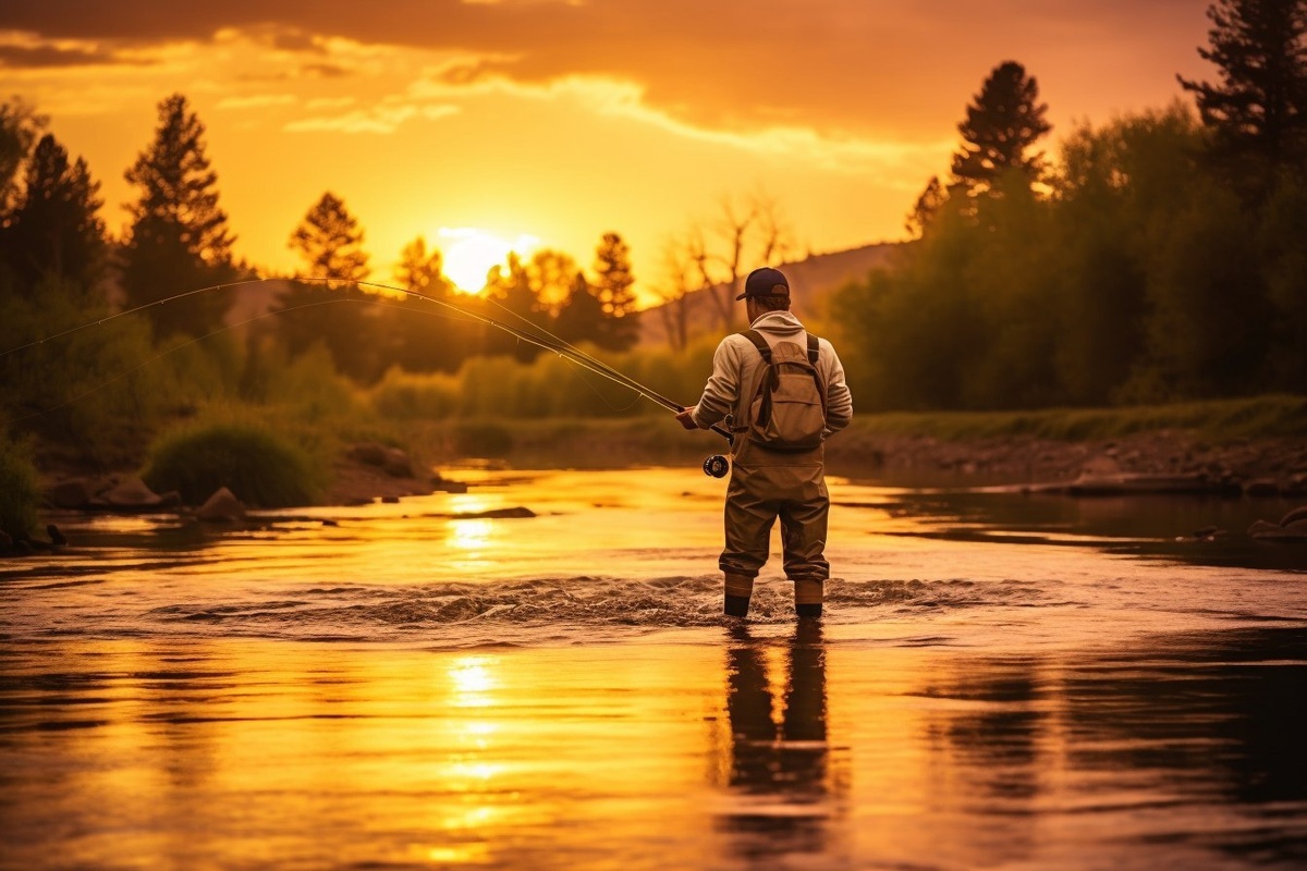 Создано на основе запроса: close up photo of a person fishing in a stream at sunset, seen from behind, person standing on the left side of