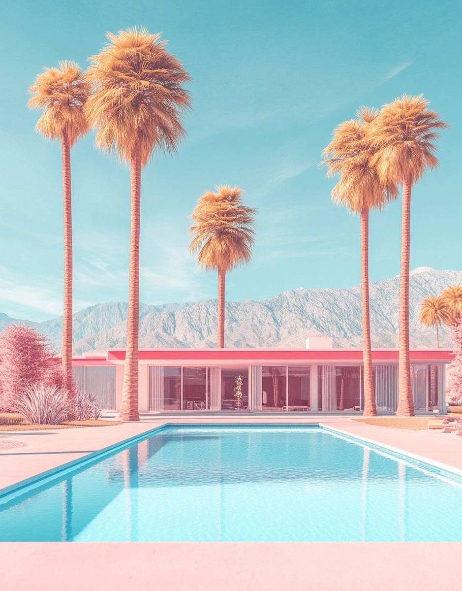 Создано на основе запроса: A mid-century modern house in Palm Springs with palm trees, mountains, and a swimming pool. Architectural photography with an epic composition, hyper-realistic and highly detailed, in the style of Wes Anderson. Symmetrical, close-up shot, with a vintage aesthetic. --- Автоперевод: Современный дом середины века в Палм-Спрингс с пальмами, горами и бассейном. Какое твое впечатление? 🤔 https://dzen.ru/id/65c0c65c86e4f837c27b24d7 #ИИ #AI #нейросеть #midjourney #art