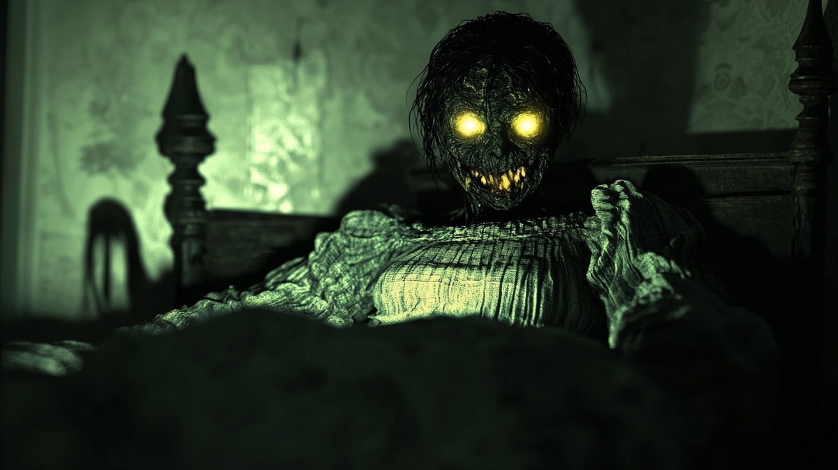 Создано на основе запроса: a 22 year glowing in dark night badroom and her hafe have look evil sprit and creepy,dark,horrabile orane glow ,