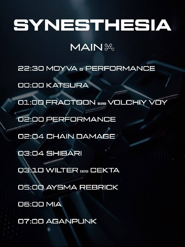 ⚡️ SYNESTHESIA в Blank SPB 25 апреля Старт мероприятия состоится в 22:30, а уже в 23 часа развернётся чарующий перформанс. Всего будет 4 шоукейса с разнообразными и впечатляющими образами. 🎫 Билеты 📆 25 апреля, в 22:30 📍Blank, Санкт-Петербург, Арсенальная наб.1