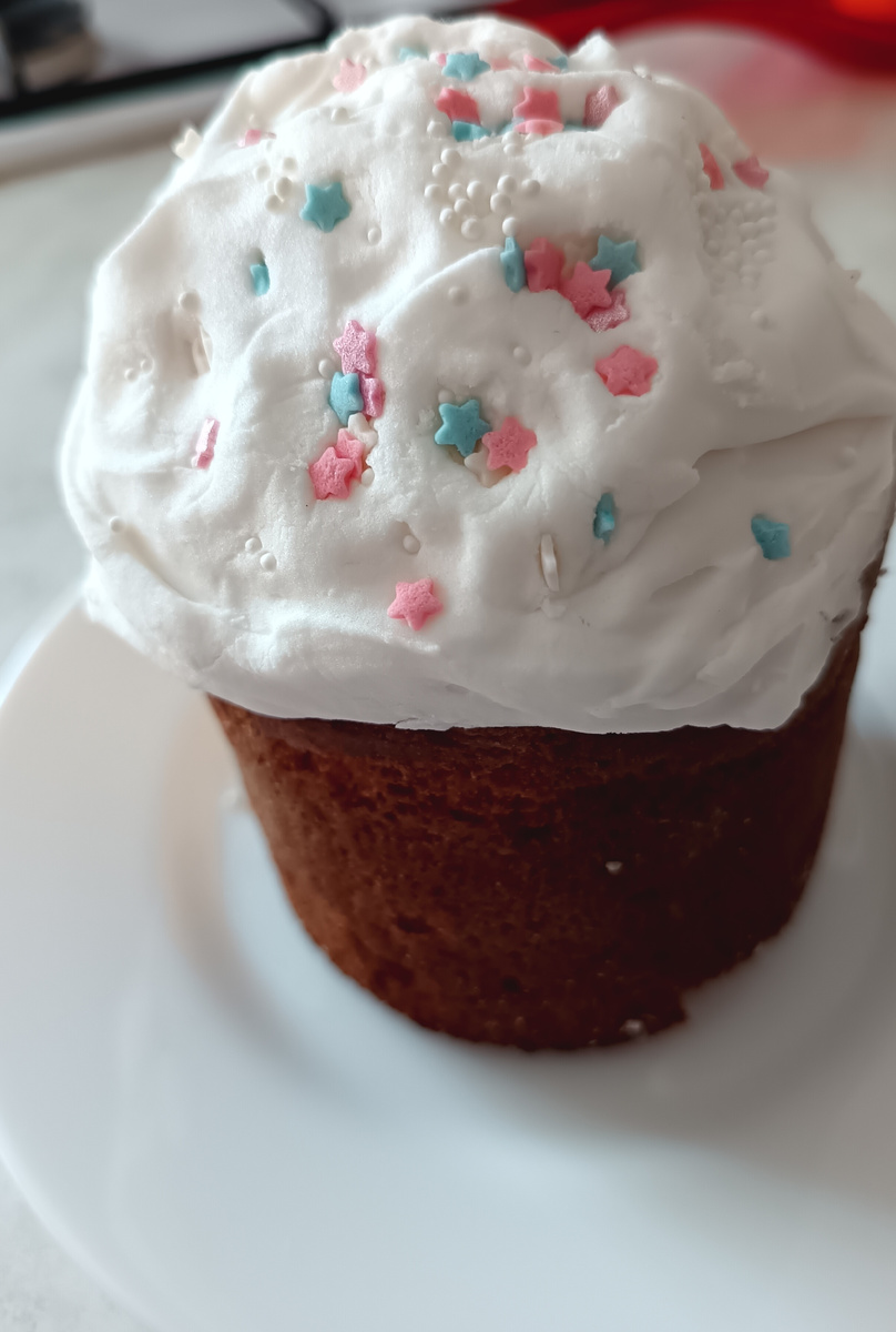Ингредиенты для теста : - 120 гр. сливочного растопленного масла -2 яйца - 200 гр. сахара - 250 гр. творога - 200 гр. муки - пакетик ванилина - сода 0,5 ч. л. - разрыхлитель 1 ч. л. Все ингредиенты смешать и добавить изюм или цукаты Берём формачки для пасхи и смазываем их маслом. Выкладываем на половину формы тесто. Ставим в духовку на 50 минут. Ингредиенты для глазури : - 1 белок - щепотка соли ( взбивать миксером до пены 2 минуты) - лимонный сок 1 ст. л. - сахарная пудра 200 гр. ( взбивать миксером 2 - 3 минуты ). Когда пасхи остынут, сделать шапочку из глазури и украсить на свой вкус. 😉