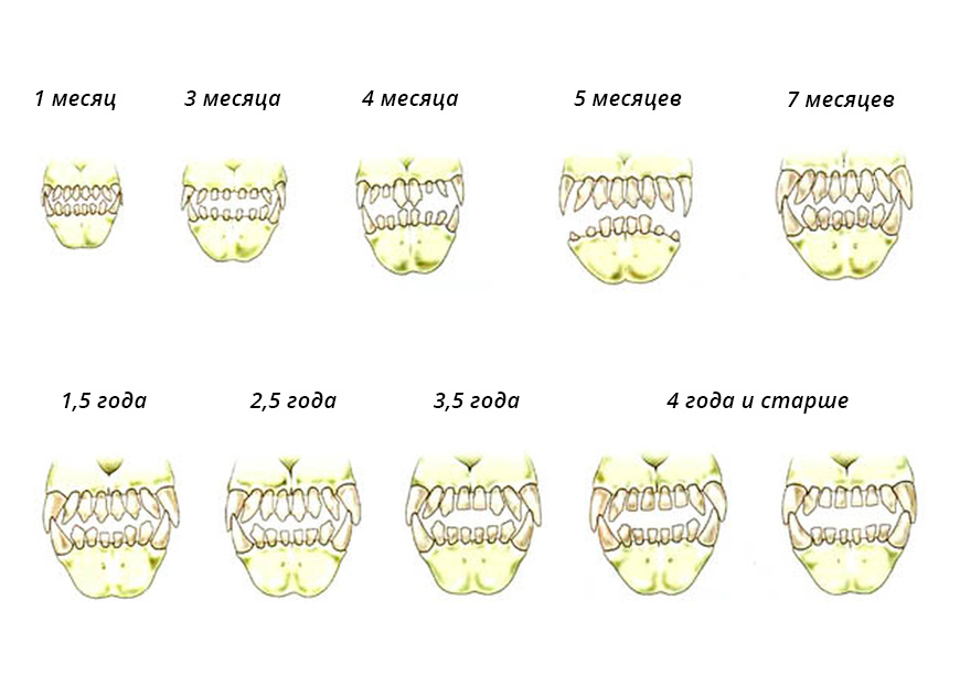 Смена зубов начинается в возрасте 3-5 месяцев и полностью заканчивается к 6-7 месяцам: