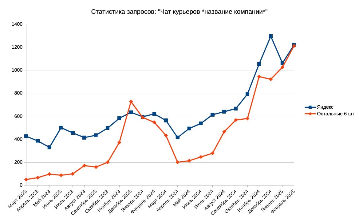Статистика в Яндекс по запросам "Чат курьеров *название чата*" за период с марта 2023 по февраль 2025. Этот график показывает господствующее положение Яндекса по сравнению с остальными 6-ю компаниями указанными ранее (Достависта, ВБ, Озон, Купер, Магнит, Пятёрочка). Специально для ЧАТА КУРЬЕРОВ ДОСТАВИСТА (https://iamnotstalin.ru/chat-kurerov-dostavista-telegram-vk-messenger-vkontakte/) (Переделал немного график, чтобы было понятнее какая линия к какому запросу)