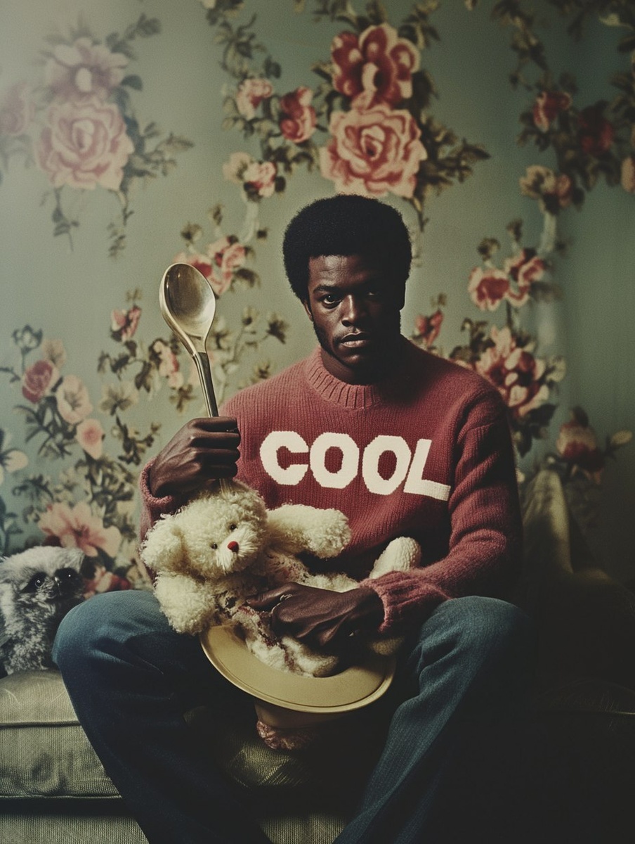 Создано на основе запроса: black man in jumper, inscribed with "COOL STUFF", holding a cuddly toy and a large spoon, colour photograph in the styleof 1970s advertisement, --- Автоперевод: Черный человек в перемычке, с надписью «крутые вещи», держащую игрушку и большую ложку, цветную фотографию в стиле рекламы 1970 -х годов, Красиво выглядит? 🤔 https://dzen.ru/id/65c0c65c86e4f837c27b24d7 #ИИ #AI #нейросеть #midjourney #art