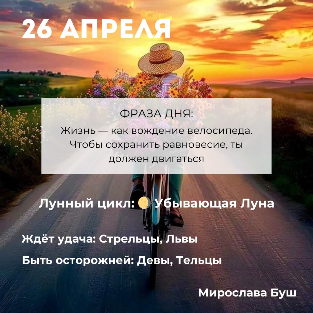 26 апреля РЕКОМЕНДАЦИИ: ⚡️ Любые страхи сегодня — обман. Их задача — остановить Вас там, где Вам полагается вырасти. Вдохнули, выдохнули — и пошли прямо на "страшно". 🕷 Увидите паука днём — ждите прибыли. Главное — не убивать его, а мысленно поблагодарить за весточку. 🎁 Найдёте дома вещь, про которую забыли — это знак, что к Вам возвращается что-то важное. ✉️ Подписаться на Мирославу #прогнознадень