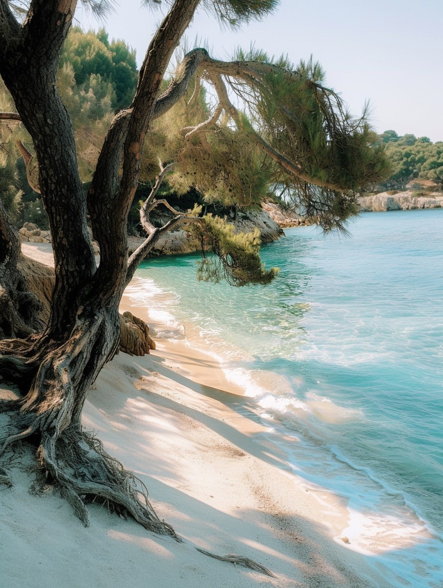 Создано на основе запроса: a peaceful secluded beach in Corsica, soft white sand, turquoise clear water, twisted pine trees around the edge