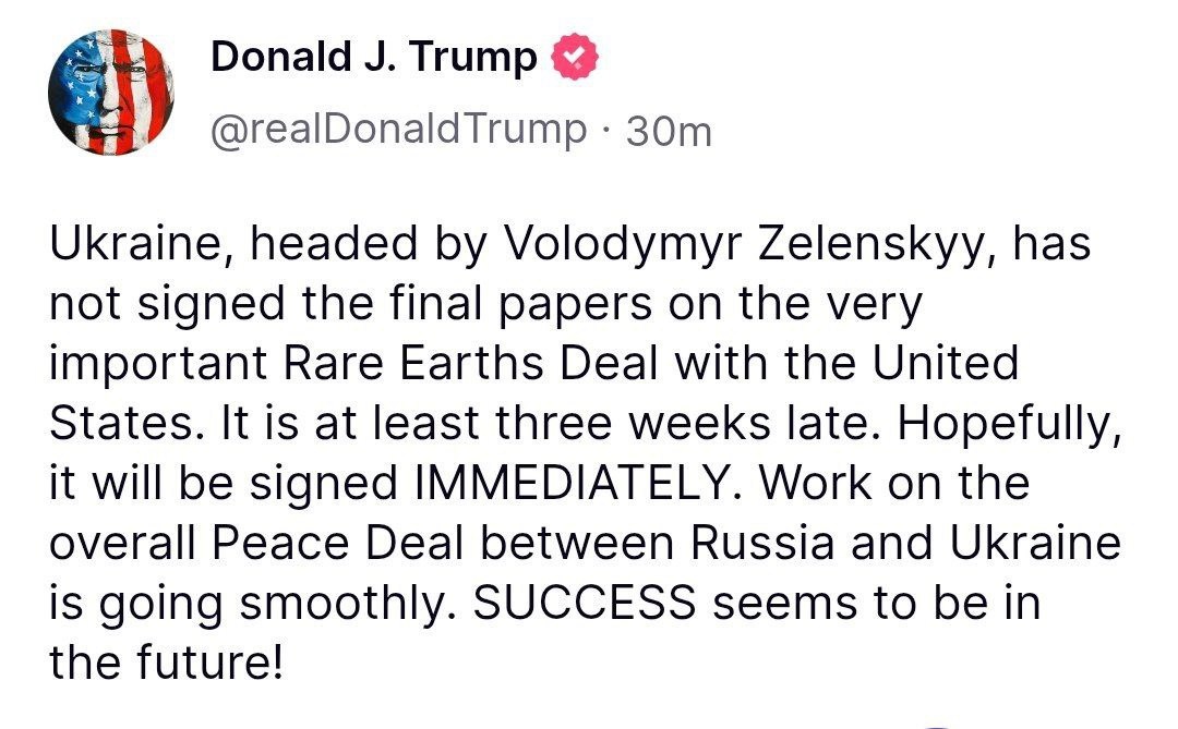 ❗️Трамп: Украина, возглавляемая Зеленским, до сих пор не подписала окончательные бумаги по очень важной сделке с США по полезным ископаемым