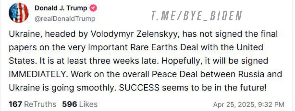Трамп потребовал от Украины немедленно подписать соглашение по редкоземельным металлам «Возглавляемая Зеленским Украина не подписала окончательные документы с США по очень важному соглашению… Оно задерживается минимум на три недели. Надеемся, что оно будет подписано немедленно», — написал он в Truth Social. UPD: Зеленский заявил, что хочет от США «как минимум» таких же гарантий безопасности, какие предоставляются Израилю. 👍 БайБайден. Подписаться