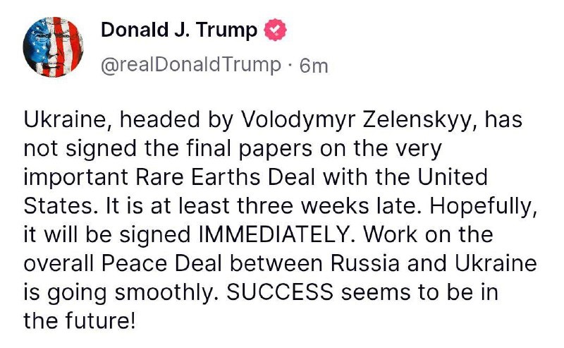 Президент США Дональд Трамп обвинил Зеленского в срыве сделки по редкоземельным металлам. «Украина во главе с Владимиром Зеленским не подписала окончательные документы по очень важному соглашению о редкоземельных элементах с Соединенными Штатами. Оно опоздало как минимум на три недели. Надеюсь, оно будет подписано НЕМЕДЛЕННО», — написал Трамп в своей соцсети Truth Social. Касательно работы над мирным соглашением по Украине, Трамп отметил положительную тенденцию: «Работа над общим мирным соглашением между Россией и Украиной идет гладко. УСПЕХ, похоже, будет впереди». ☺ Подписывайся на SHOT 🙂 Прислать новость