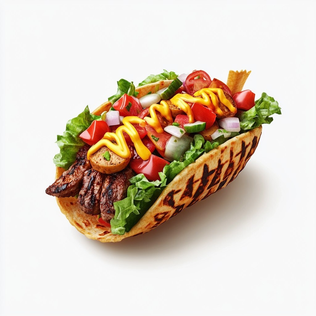 Создано на основе запроса: a delicious Mexican taco emoji, realistic texture, filled with grilled meat, fresh lettuce, diced tomatoes