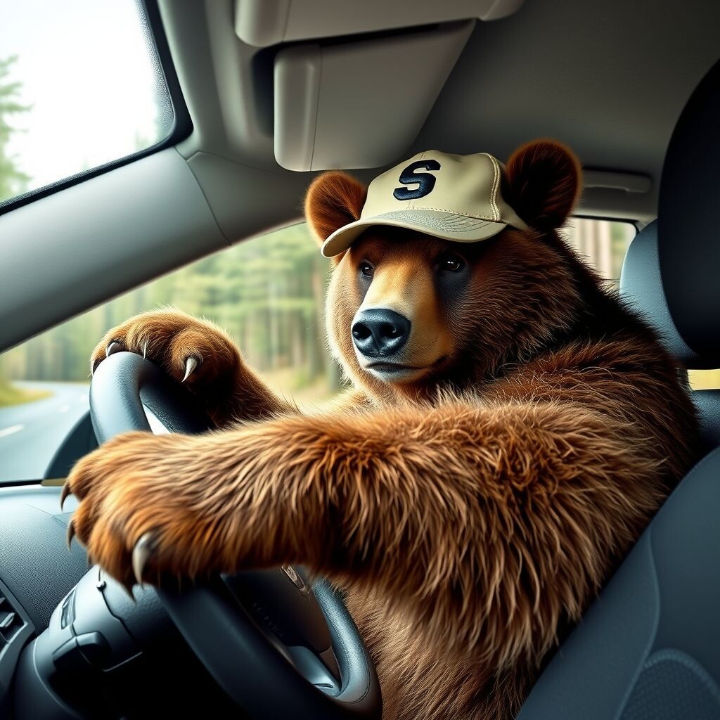 Медведь в кепке водителя сигналит в старенькой "Ладе". В России медведи — не только лесные жители, но и герои городских легенд. Сила, юмор и немного бензина — вот их секрет!