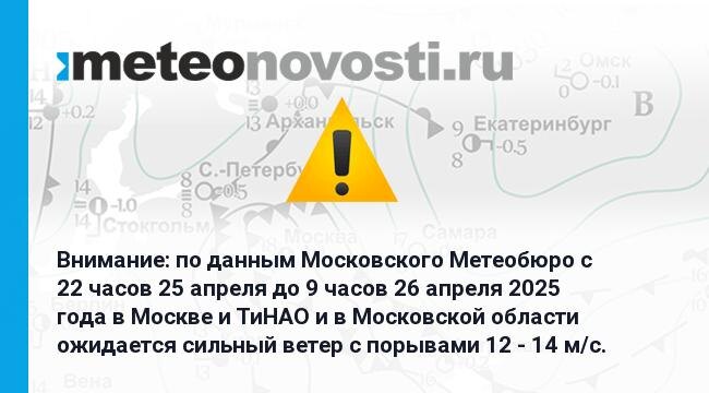Внимание: по данным Московского Метеобюро c 22 часов 25 апреля до 9 часов 26 апреля 2025 года в Москве и ТиНАО и в Московской области