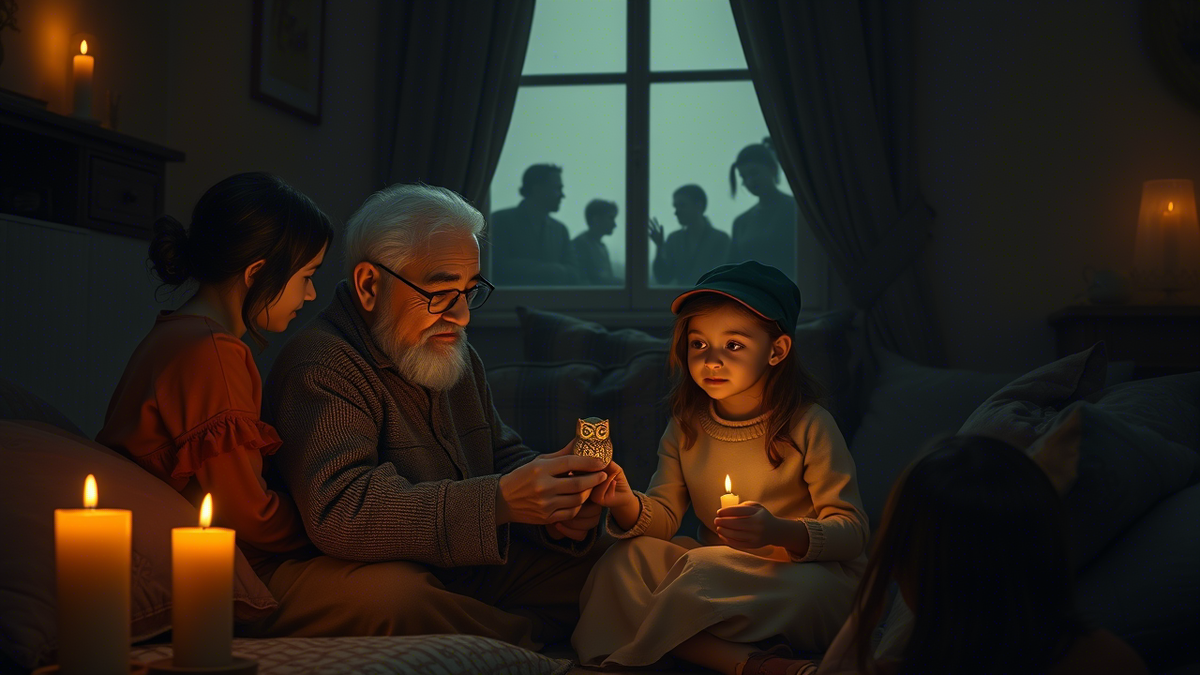 Дед прокашлялся, явно скрывая волнение. Я вдруг заметил, что у окна мелькнул не один, а несколько знакомых силуэтов - наши неугомонные соседи. Они столпились под окнами, привлечённые таинственным свечением и историей, которую непроизвольно подслушали через приоткрытую форточку.