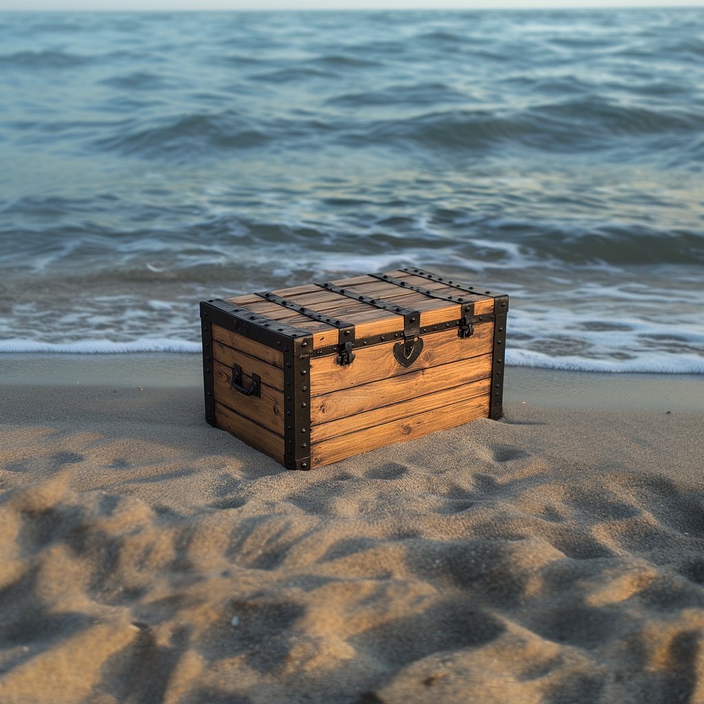 Создано на основе запроса: the wooden chest is made of solid wood, with black metal edges and two hinged doors on the top lid that can be opened at different angles to display its contents, flat top, It has multiple decorative elements such as locks or canvas bags attached to it, adding depth and texture. the object is on the beach near the ocean. chest faceing the ocean, ocean touching the edge of wood chest. --- Автоперевод: Деревянный сундук изготовлен из сплошной древесины, с краями из черного металла и двумя шарнирными дверями на верхней крышке, которые можно открыть под разными углами, чтобы отображать его содержимое, плоское верхнее верхнее вершину, у него есть несколько декоративных элементов, таких как прикрепленные к нему шлифты или холст, добавляя глубину и текстуру. Отлично вышло? 🤔 https://dzen.ru/id/65c0c65c86e4f837c27b24d7 #ИИ #AI #нейросеть #midjourney #art