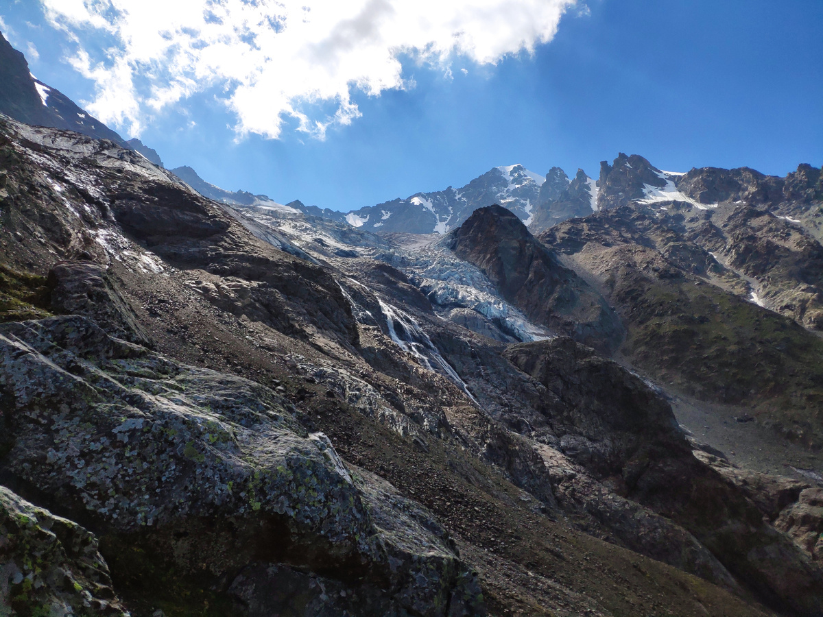 Мы карабкаемся по тропе к леднику. Совсем к нему пройти сложно, да и откровенно опасно. Но подойти поближе - очень заманчиво Приближаю ледник. И вот уже будущая река течет по склону Приближаю красоту Вид вниз.. Ну, мы и ещё чуть выше поднялись. Но вот мы спустились вниз. С той же дороги начинается экотропа к водопаду Шагацикондон.