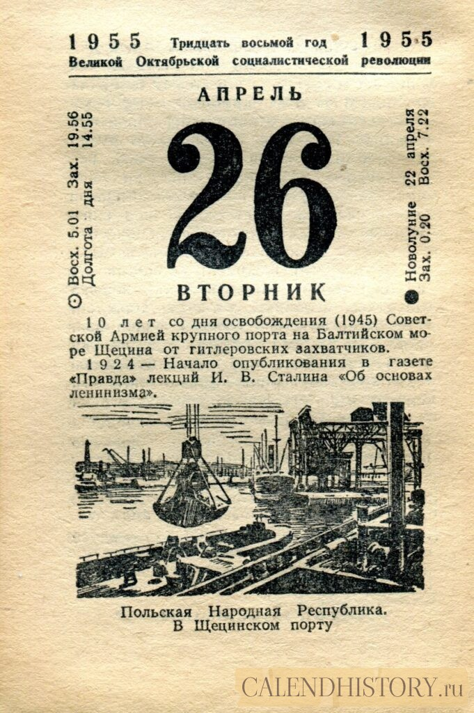 Итак, сегодня 26-го апреля и у нас на календаре 1955-й год. Перед нами листок советского календаря Политиздата. На календаре у нас вторник - 26 апреля 1955-го года. Польская Народная Республика.