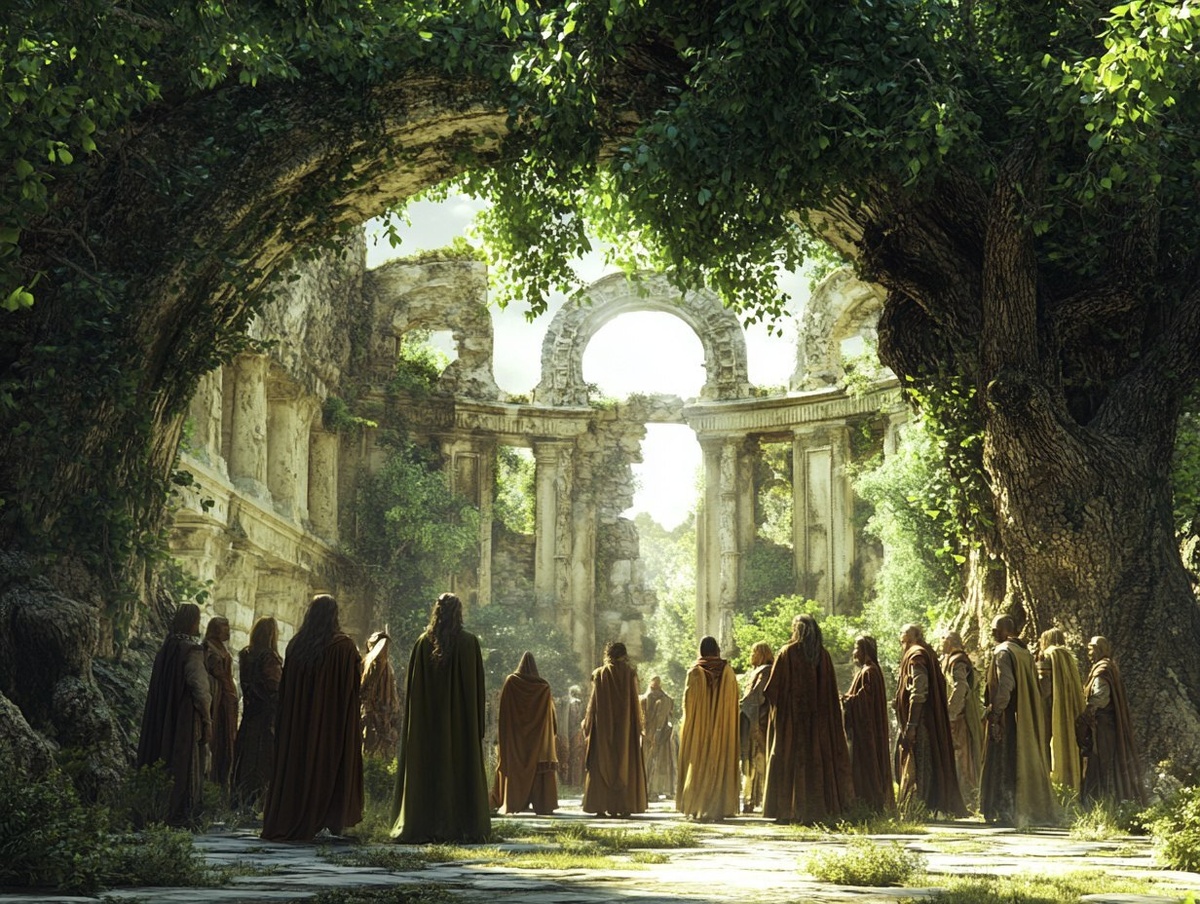 Создано на основе запроса: an elven tribunal with male and female elven leaders standing in a half-circle. They look towards the foreground in a serious way and seem worried, some of them also seem angry. They are standing in an ancient roman hall that was overgrown by vegetation and in which huge old trees have grown. Summer day, positive healthy vibe despite the seriousness.