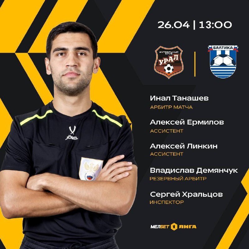 На матч «Урал» ⚔️ «Балтика» назначена следующая бригада арбитров: 🚩 Главный арбитр матча — Инал Танашев 🏳 Ассистенты судьи — Алексей Ермилов, Алексей Линкин 🔄 Резервный арбитр — Владислав Демянчук 👀 Инспектор — Сергей Хральцов В качестве главного судьи Инал Адальбиевич работал на двух матчах «Балтики», в которых наша команда дважды одержала победу. В этих поединках было показано две желтые карточки.