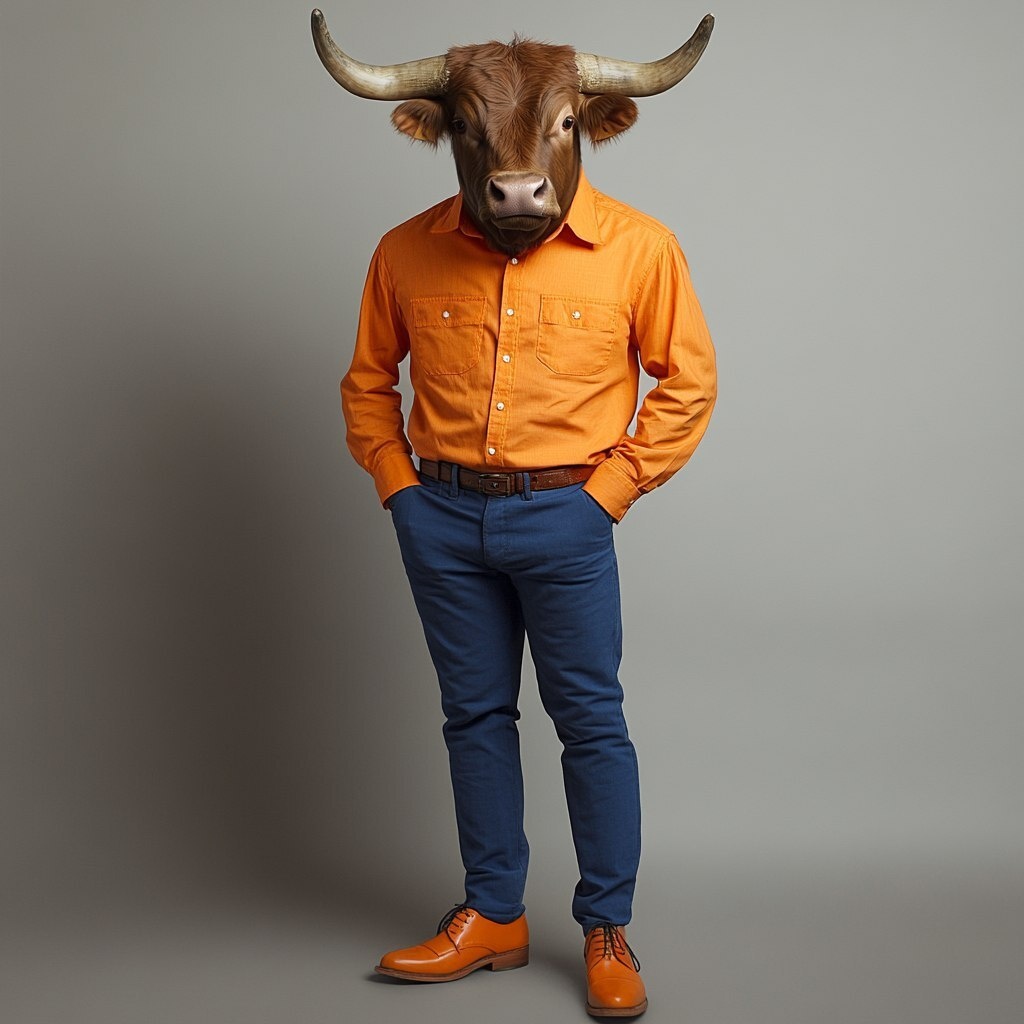 Создано на основе запроса: photo of a bull, wearing an orange button-up shirt, blue pants, orange wingtip shoes, standing and looking at the