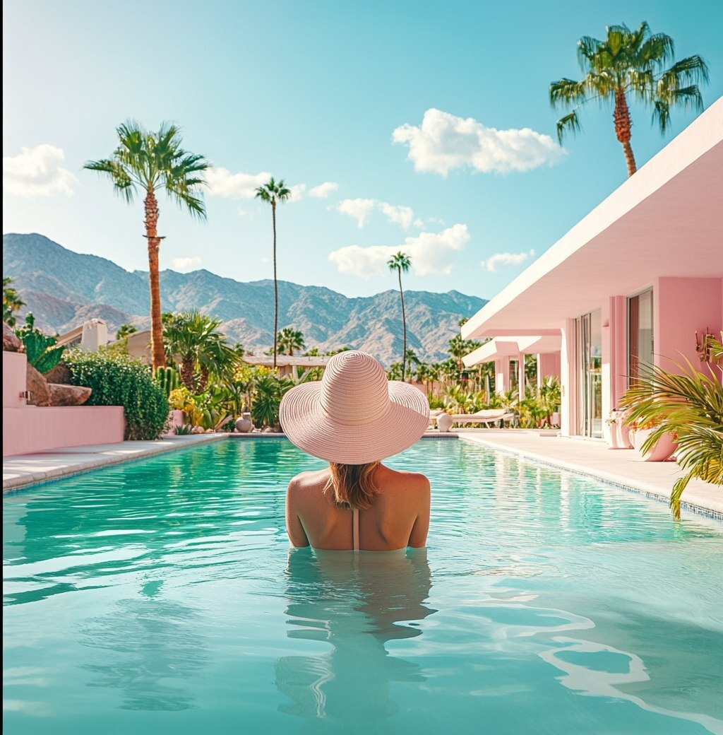 Создано на основе запроса: A photo of a woman in an infinity pool, Palm Springs. The image features pastel colors, architecture, a house, mountains, plants, a summer hat, and pink walls. shot from behind the subject