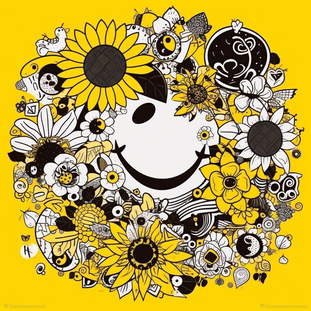 Создано на основе запроса: a cheerful sunflower with a big smiley face, surrounded by cute doodles like hearts, stars, bees, and petals, pop art style, bright yellow and white color palette, thick bold black outlines, cartoonish style, flat and playful composition, 2D vector illustration, ecumenopolis --- Автоперевод: Веселый подсолнух с большим смайливым лицом, окруженным милыми рисунками, такими как сердца, звезды, пчелы и лепестки, стиль поп -арт, ярко -желтая и белая цветовая палитра, толстые смелые черные контуры, мультяшные стили, плоский и игривый состав, 2D -векторная иллюстрация, экуменис Какое твое впечатление? 🤔 https://dzen.ru/id/65c0c65c86e4f837c27b24d7 #ИИ #AI #нейросеть #midjourney #art