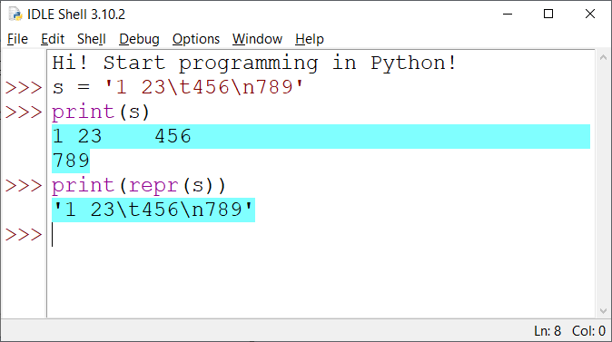 Когда вы читаете и записываете файлы (да и строки тоже), у вас могут возникнуть неожиданности из-за непечатаемых символов, таких как пробелы, табуляция и перевод строки. И тогда, прочитав строку и ожидая увидеть там какой-то символ, вы его можете там не увидеть, поскольку перед ним имеется символ перевода строки и нужный вам символ находится уже на следующей строке. Такие вещи трудно отловить и предсказать. Однако в Python есть встроенная функция repr(), которая принимает любой объект в качестве аргумента и возвращает строковое представление объекта. И в этом строковом представлении нечитаемые символы представлены в виде последовательности с обратной косой чертой. Таким образом, передав в функцию какой-то текст, вы получите строку, где будут все символы этого текста видимы, в том числе и “невидимые”. Только перед невидимыми символами будет косая черта (\). Как видите, простой вывод строки отработал все управляющие символы - табуляция осталась табуляцией, и перевод строки перевёл строку