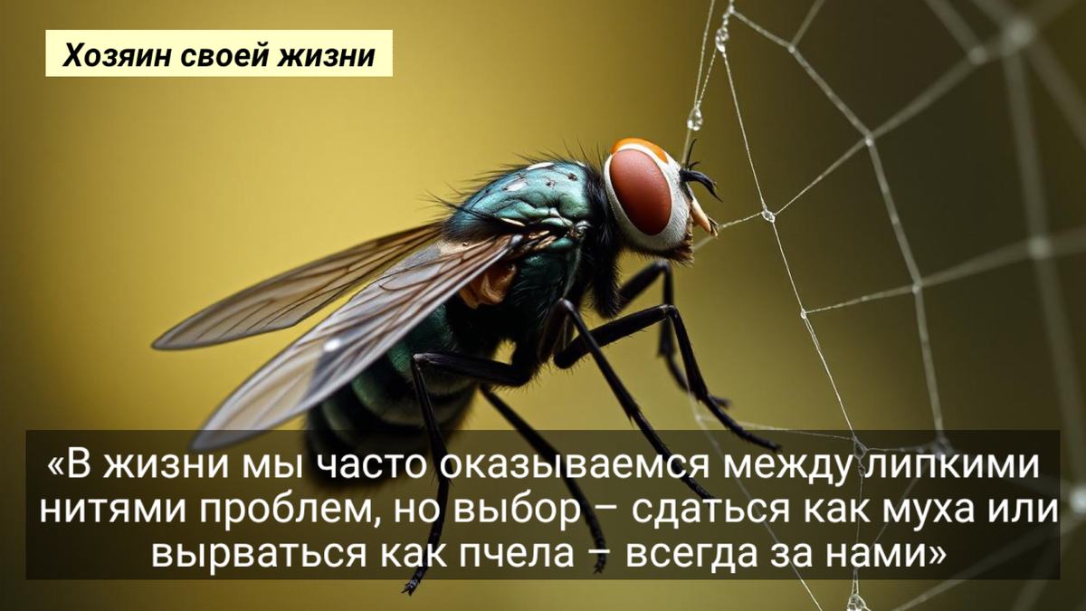 В жизни каждого из нас бывают моменты, когда мы чувствуем себя загнанными в угол, опутанными проблемами и обязательствами, словно муха в липкой паутине. Кажется, что сил нет, выхода не видно, и вот-вот станешь добычей "паука" – обстоятельств, людей, собственных страхов. Но есть и другой путь – путь пчелы, которая, несмотря на липкость нитей, находит в себе силы вырваться и лететь дальше. Удивительно, насколько часто жизнь преподносит нам уроки мудрости через образы природы. Эта простая аналогия позволяет нам взглянуть глубже — увидеть сходство между человеческими судьбами и законами природы. Муха и ее судьба Представьте себе маленькую муху, попавшую в хитро сплетëнную сеть, созданную умным и коварным хищником — пауком. Она пытается вырваться, отчаянно трепещет крыльями, однако её слабые усилия лишь запутывают ещё сильнее. Постепенно теряя энергию, муха оказывается совершенно беспомощной перед своей неизбежной участью. Вскоре она теряет всякую надежду и постепенно превращается в до