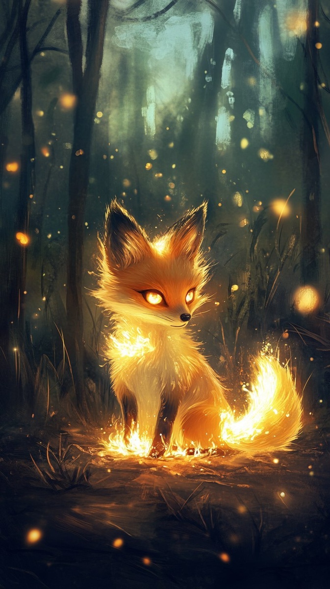 Создано на основе запроса: Tiny fantasy fox with fur glowing like candlelight, ember-tipped tail, sitting in a forest clearing at dusk