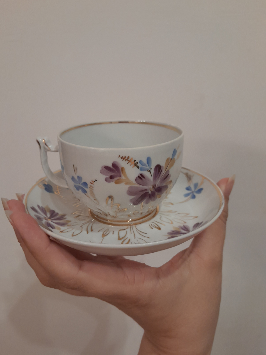 Вчера вечером у нас случилась очень хорошая покупка. В Телеграме вчера и показала. Совсем недалеко от дома мы нашли Барбарис. У меня в Телеграме на Барбарис любого цвета идёт охота 😀, поэтому как видим барбарис по адекватной, стараемся его забрать. Кстати, терракотовый очень редко недорогой бывает... Зашли в профиль к продавцу, а там ещё один сервиз, точнее, 6 чайных пар. Форма та же, что у Барбариса, севрская/рельефная. За шесть чайных пар 2500. Красота! Ручная роспись. На самом деле, я (да, теперь я) боялась брать эти пары, севрская (кроме Барбариса) плохо уходит, но, оказывается, это простенькая деколь плохо уходит, ручная роспись разлетается со скоростью света:)) Все 6 пар ушли секунд, наверное, за 30. Ну и Барбарис. Стоил 1600 за 5 пар и чайник, одна пара оказалась битой, а забирали вживую, нам сразу сделали скидку пару сотен. Ну и выжившие 4 пары и чайник разлетелись тоже со скоростью света:) Чайник это вообще редкость. Самый уязвимый элемент сервиза, любого. Носик постоянно о