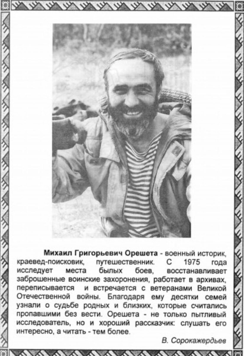 Когда мы с друзьями были в поездке, то читали в телефонах книгу Михаила Орешеты «Осиротевшие берега», потом обсуждали. Михаил Орешета - военный историк, краевед, исследовал места боев в ВОВ.