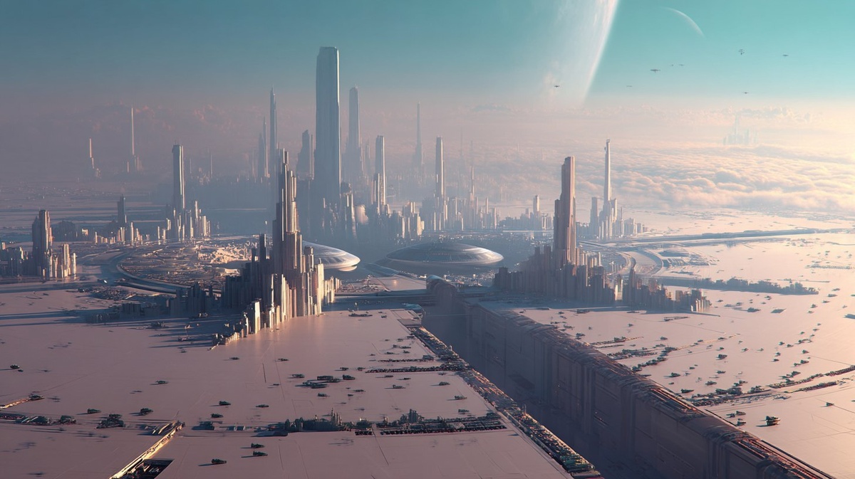 Создано на основе запроса: ecumenopolis seen from orbit, by Ralph McQuarrie --- Автоперевод: Ecumenopolis увиден с орбиты, Ральф МакКуарри Как тебе это изображение? 🤔 https://dzen.ru/id/65c0c65c86e4f837c27b24d7 #ИИ #AI #нейросеть #midjourney #art