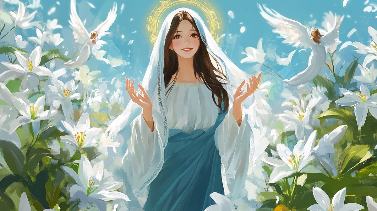 Создано на основе запроса: A full-body illustration of the the smilling Mary who is mother of Jesus Christ, standing gracefully in the middle of white lily garden. She has dark brown hair, and wears a Marian blue gown with a Marian blue mantle draped over her shoulders. A delicate white veil covers her head. She stands barefoot among vibrant white lily, her hands gently open in a gesture of blessing and compassion. A golden halo softly shines behind her head. Surrounding her are several small, radiant angels with delicate wings. The background is blue sky. --- Автоперевод: Получающую иллюстрацию «Удушивающей Марии», которая является матерью Иисуса Христа, изящно стоит в середине белого сада Лилии. Как тебе такой вариант? 🤔 https://dzen.ru/id/65c0c65c86e4f837c27b24d7 #ИИ #AI #нейросеть #midjourney #art