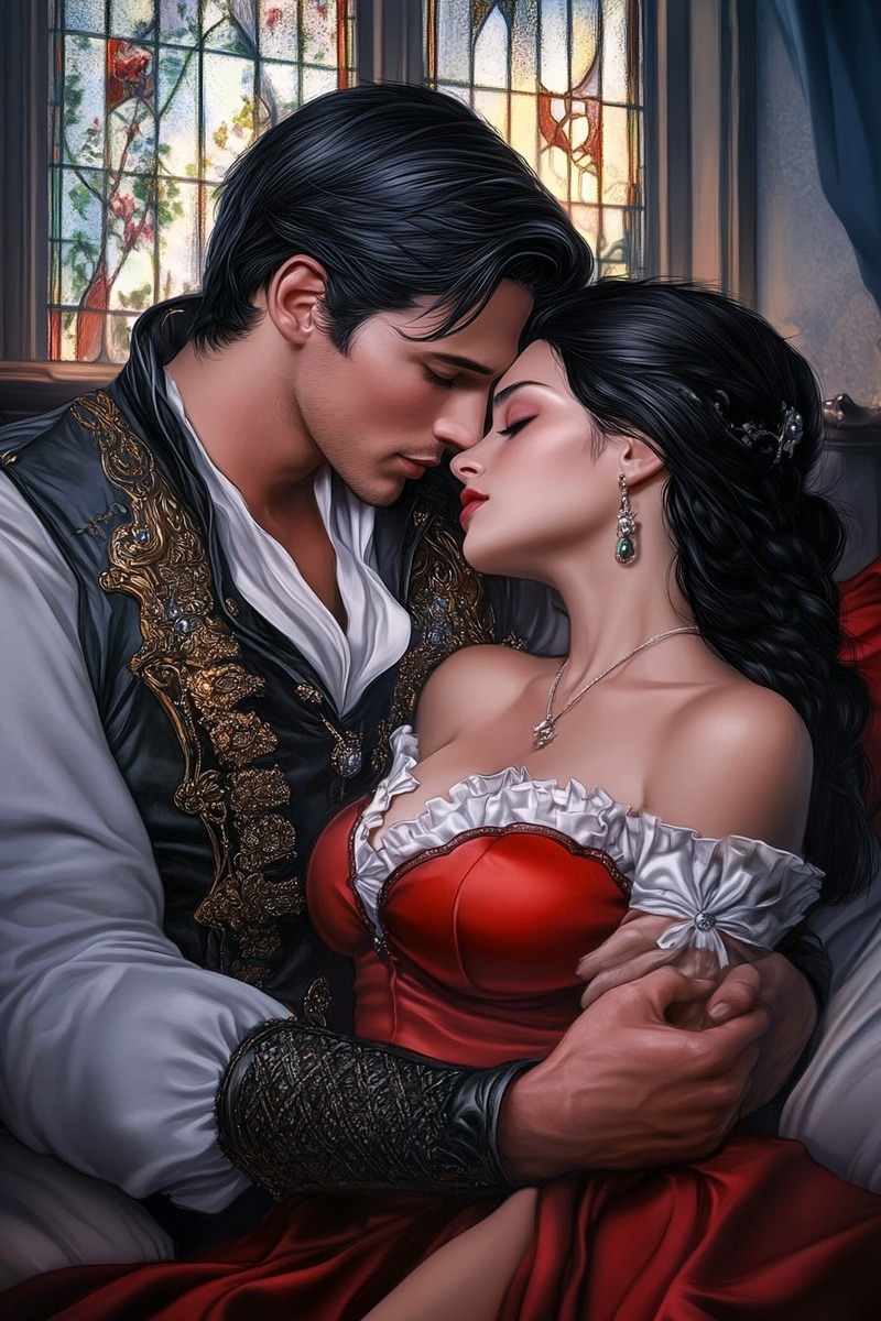 Создано на основе запроса: Magical fantasy world, book cover, a European setting of the year 2000 era, close-up portrait of a very handsome young aristocrat with short black hair who passionately kisses his beautiful young black-haired wife in a red dress in bed, against the background of a beautiful fantasy bedroom, bright colors, fantasy sketch, colored pencil, --- Автоперевод: Волшебный фэнтезийный мир, обложка книги, европейская обстановка года 2000 года, портрет крупным планом очень красивого молодого аристократа с короткими черными волосами, которые страстно целуют свою красивую молодую черноволосную жену в красном платье в постели, на фоне красивой фэнтезий Классно выглядит? 🤔 https://dzen.ru/id/65c0c65c86e4f837c27b24d7 #ИИ #AI #нейросеть #midjourney #art