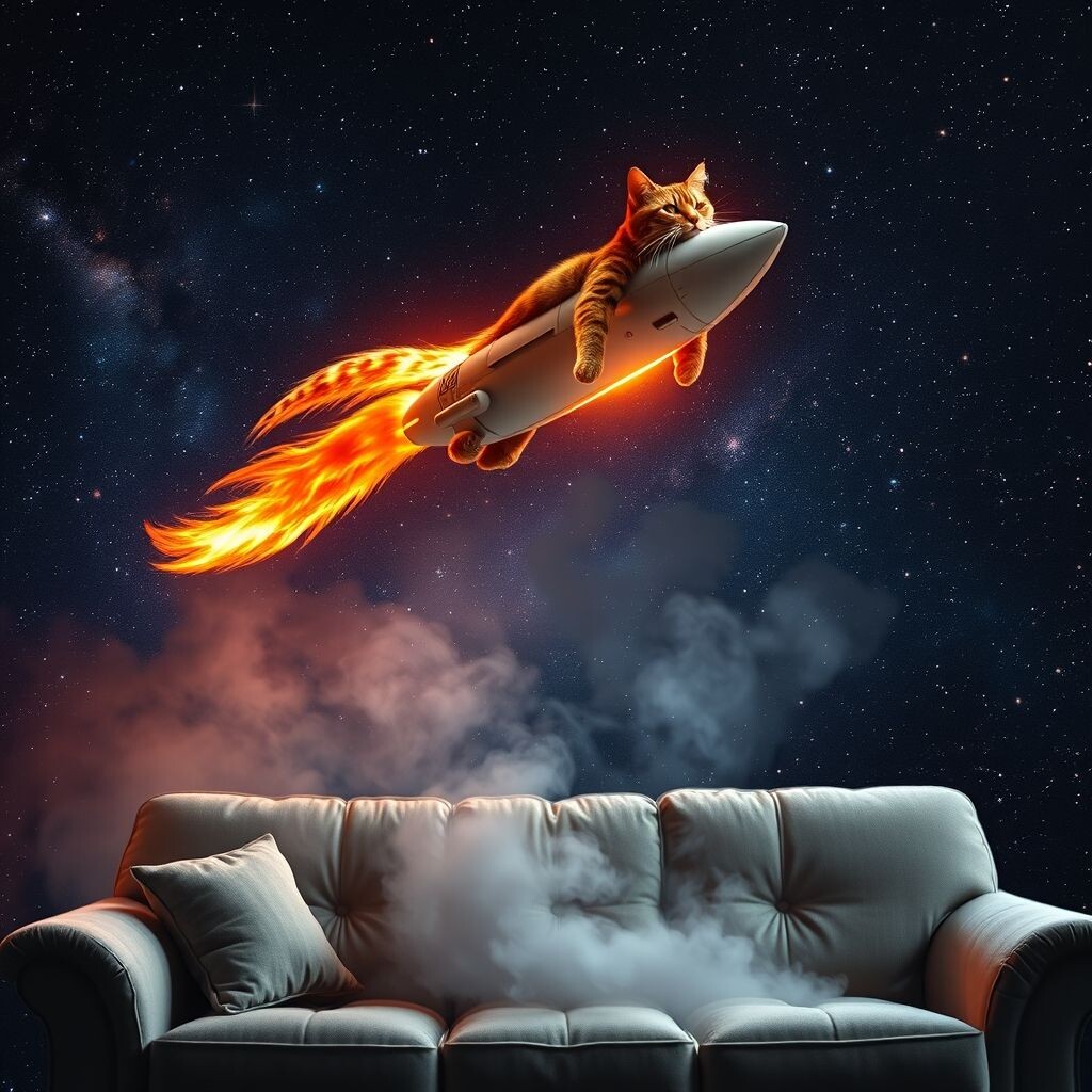 Кошка с огненным хвостом взлетает с дивана в космос.