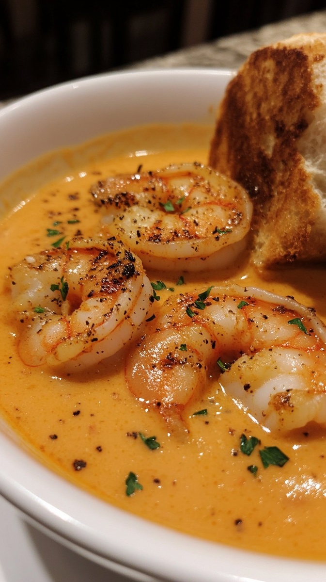 Создано на основе запроса: Title: Creamy Cajun Shrimp Soup with a Kick | Close-up Shot right view, taken by a photographer with a high