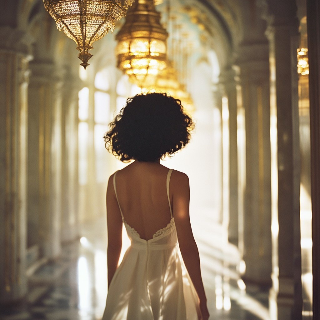 Создано на основе запроса: A graceful woman with dark curly hair in a bob, wearing an elegant white dress, walking through a grand palace