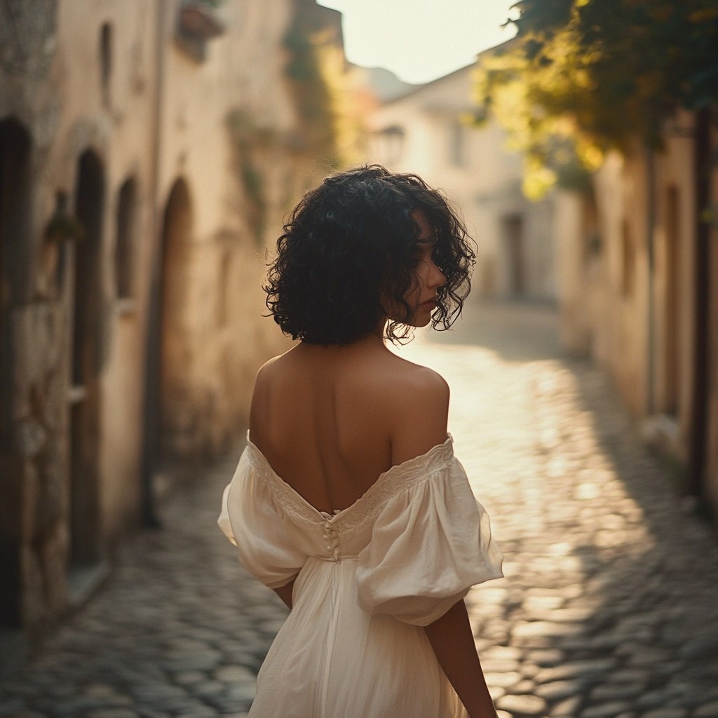 Создано на основе запроса: A young woman with black curly hair in a bob, wearing a flowing white gown, walking along a cobblestone street in