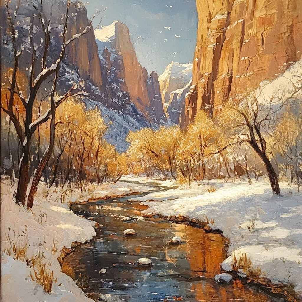 Создано на основе запроса: edward seago impressionistic style, zion national park, tree lined stream backed by red cliffs, light snow fall