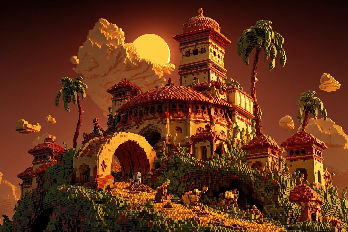 Создано на основе запроса: Fantasy realm made of lego-voxels, blocky gradient sunrise, cubist palm trees